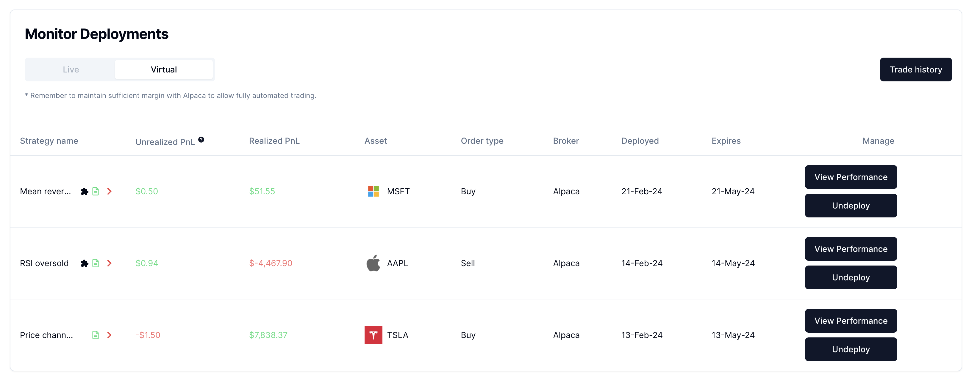 * Click the Trade option to access the Trade page. By default, when you access the Trade page, you will see all virtual and live strategies that are currently live/deployed listed